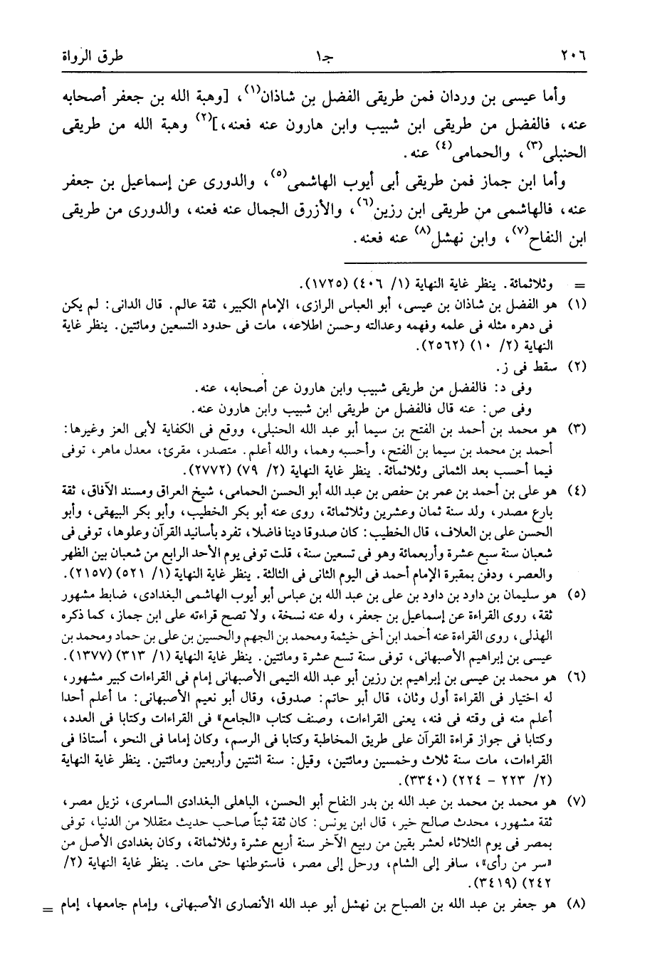 (¬1) هو الفضل بن شاذان بن عيسى، أبو العباس الرازى، الإمام الكبير، ثقة عالم. قال الدانى: لم يكن فى دهره مثله فى علمه وفهمه وعدالته وحسن اطلاعه، مات فى حدود التسعين ومائتين. ينظر غاية النهاية (2/ 10) (2562).