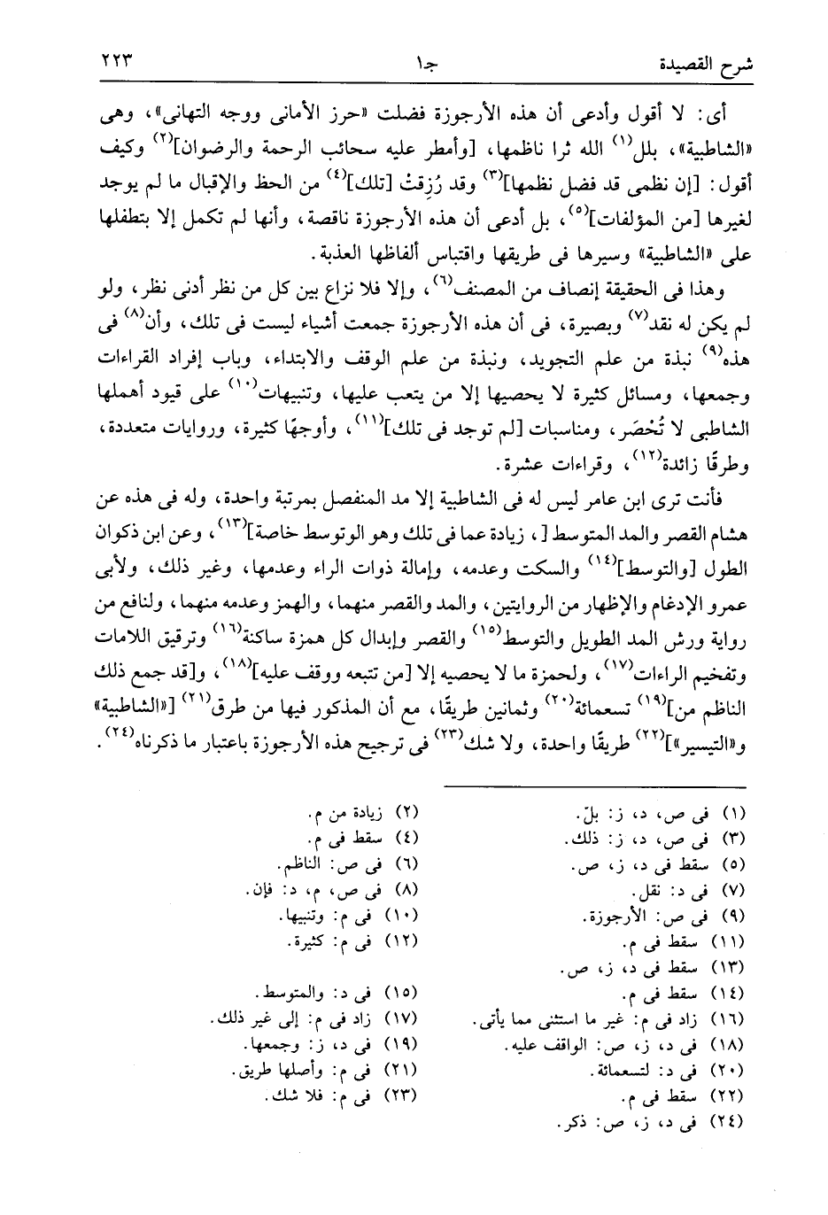 أى: لا أقول وأدعى أن هذه الأرجوزة فضلت «حرز الأمانى ووجه التهانى»، وهى «الشاطبية»، بلل (¬1) الله ثرا ناظمها، [وأمطر عليه سحائب الرحمة والرضوان] (¬2) وكيف أقول: [إن نظمى قد فضل نظمها] (¬3) وقد رزقت [تلك] (¬4) من الحظ والإقبال ما لم يوجد لغيرها [من المؤلفات] (¬5)، بل أدعى أن هذه الأرجوزة ناقصة، وأنها لم تكمل إلا بتطفلها على «الشاطبية» وسيرها فى طريقها واقتباس ألفاظها العذبة.