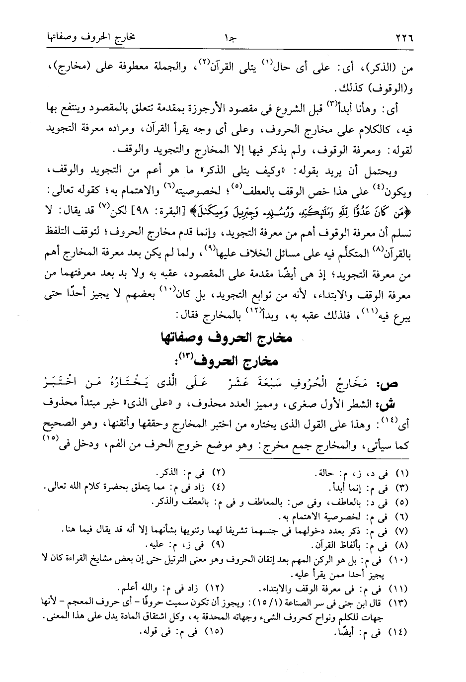 مَنْ كانَ عَدُوًّا لِلَّهِ وَمَلائِكَتِهِ وَرُسُلِهِ وَجِبْرِيلَ وَمِيكالَ [البقرة: 98] لكن (¬7) قد يقال: لا نسلم أن معرفة الوقوف أهم من معرفة التجويد، وإنما قدم مخارج الحروف؛ لتوقف التلفظ بالقرآن (¬8) المتكلّم فيه على مسائل الخلاف عليها (¬9)، ولما لم يكن بعد معرفة المخارج أهم من معرفة التجويد؛ إذ هى أيضا مقدمة على المقصود، عقبه به ولا بد بعد معرفتهما من معرفة الوقف والابتداء، لأنه من توابع التجويد، بل كان (¬10) بعضهم لا يجيز أحدا حتى يبرع فيه (¬11)، فلذلك عقبه به، وبدأ (¬12) بالمخارج فقال: