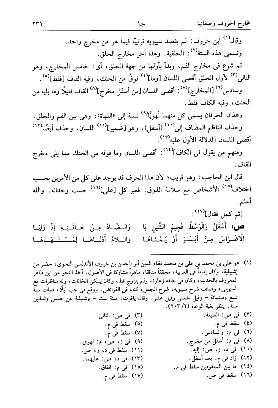 (¬1) هو على بن محمد بن على بن محمد نظام الدين أبو الحسن بن خروف الأندلسى النحوى، حضر من إشبيلية، وكان إماما فى العربية، محققا مدققا، ماهرا مشاركا فى الأصول. أخذ النحو عن ابن طاهر المعروف بالخدب، وكان فى خلقه زعارة، ولم يتزوج قط، وكان يسكن الخانات، وله مناظرات مع السهيلى، وصنف شرح سيبويه، شرح الجمل، كتابا فى الفرائض. ووقع فى جب ليلا، فمات سنة تسع وستمائة- وقيل خمس وقيل عشر. وقال ياقوت: سنة ست- بإشبيلية عن خمس وثمانين سنة. ينظر بغية الوعاة (2/ 203).