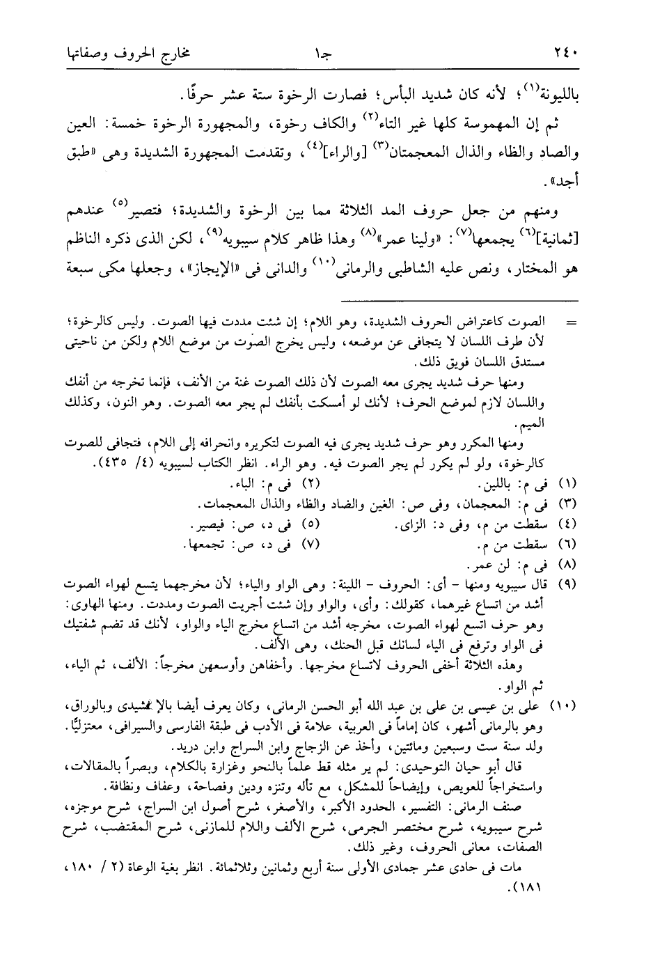 ومنهم من جعل حروف المد الثلاثة مما بين الرخوة والشديدة؛ فتصير (¬5) عندهم [ثمانية] (¬6) يجمعها (¬7): «ولينا عمر» (¬8) وهذا ظاهر كلام سيبويه (¬9)، لكن الذى ذكره الناظم هو المختار، ونص عليه الشاطبى والرمانى (¬10) والدانى فى «الإيجاز»، وجعلها مكى سبعة