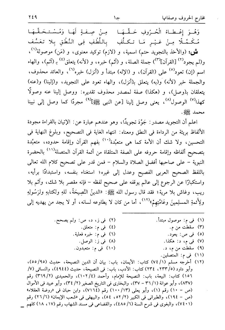 اعلم أن التجويد مصدر: جوّد تجويدا، وهو عندهم عبارة عن: الإتيان بالقراءة مجودة الألفاظ بريئة من الرداءة فى النطق ومعناه: انتهاء الغاية فى التصحيح، وبلوغ النهاية فى التحسين، ولا شك أن الأمة كما هى متعبّدة (¬10) بفهم القرآن وإقامة حدوده، متعبّدة بتصحيح ألفاظه وإقامة حروفه على الصفة المتلقاة من أئمة القرآن المتصلة (¬11) بالحضرة النبوية- على صاحبها أفضل الصلاة والسلام- فمن قدر على تصحيح كلام الله تعالى باللفظ الصحيح العربى الفصيح وعدل إلى غيره؛ استغناء بنفسه، واستبدادا برأيه، واستكبارا عن الرجوع إلى عالم يوقفه على صحيح لفظه- فإنه مقصر بلا شك، وآثم بلا ريب، وغاش بلا مرية؛ فقد قال رسول الله صلى الله عليه وسلم: «الدين النّصيحة، لله ولكتابه ولرسوله ولأئمة المسلمين وعامّتهم» (¬12)، أما من كان لا يطاوعه لسانه، أو لا يجد من يهديه إلى
