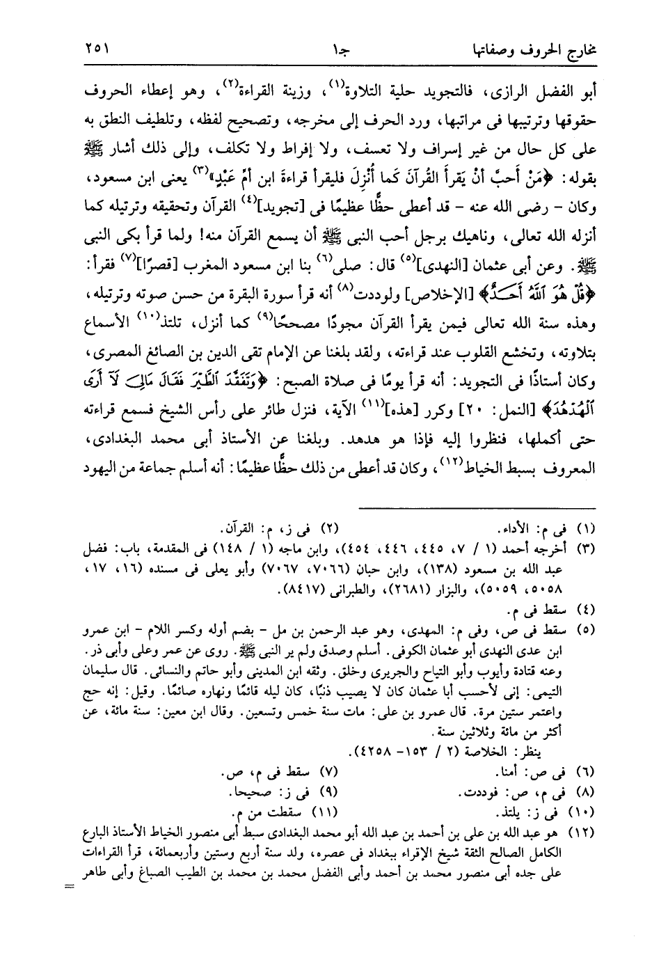 قُلْ هُوَ اللَّهُ أَحَدٌ [الإخلاص] ولوددت (¬8) أنه قرأ سورة البقرة من حسن صوته وترتيله، وهذه سنة الله تعالى فيمن يقرأ القرآن مجودا مصححا (¬9) كما أنزل، تلتذ (¬10) الأسماع بتلاوته، وتخشع القلوب عند قراءته، ولقد بلغنا عن الإمام تقى الدين بن الصائغ المصرى، وكان أستاذا فى التجويد: أنه قرأ يوما فى صلاة الصبح: وَتَفَقَّدَ الطَّيْرَ فَقالَ ما لِيَ لا أَرَى الْهُدْهُدَ [النمل: 20] وكرر [هذه] (¬11) الآية، فنزل طائر على رأس الشيخ فسمع قراءته حتى أكملها، فنظروا إليه فإذا هو هدهد. وبلغنا عن الأستاذ أبى محمد البغدادى، المعروف بسبط الخياط (¬12)، وكان قد أعطى من ذلك حظّا عظيما: أنه أسلم جماعة من اليهود
