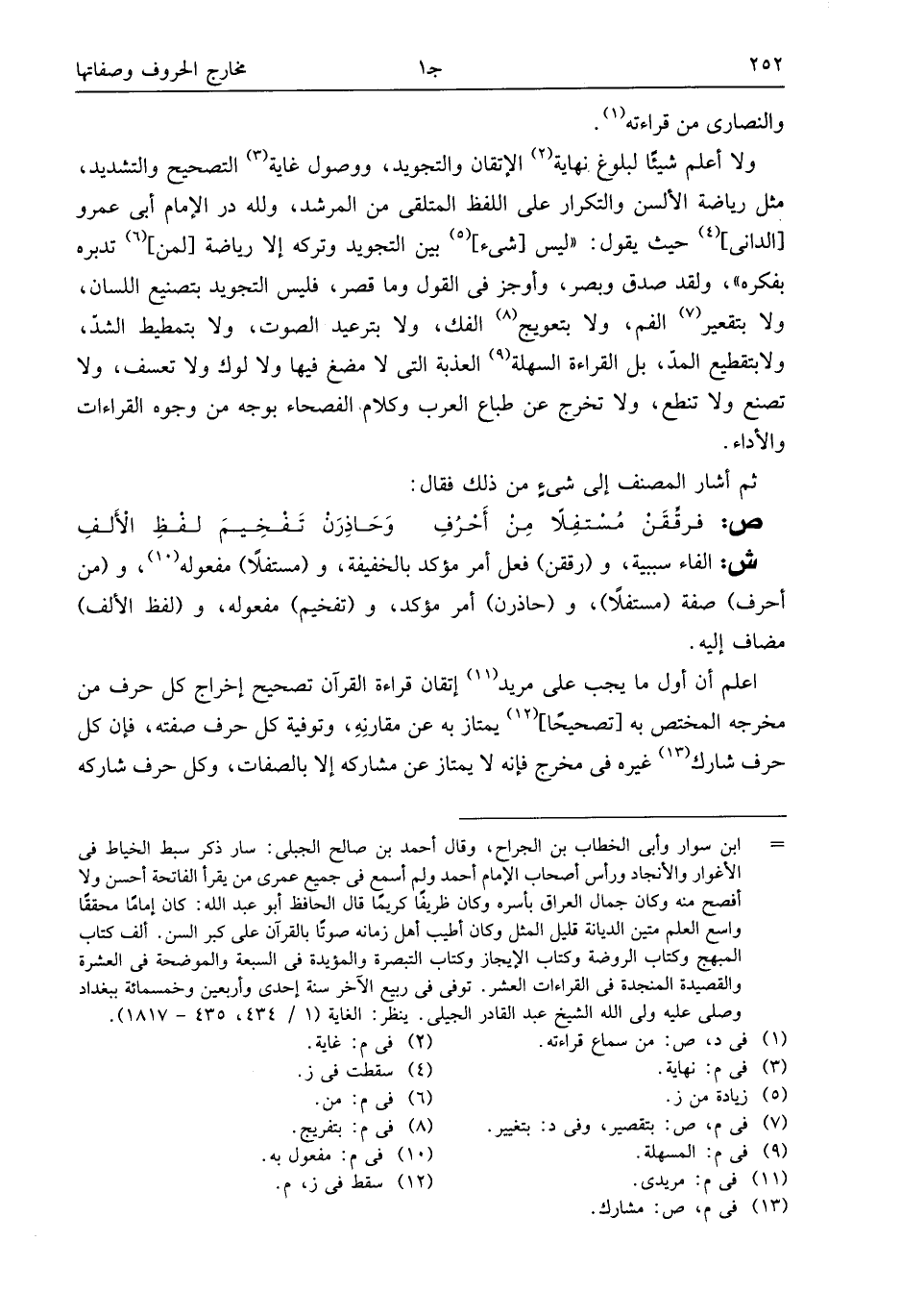 اعلم أن أول ما يجب على مريد (¬11) إتقان قراءة القرآن تصحيح إخراج كل حرف من مخرجه المختص به [تصحيحا] (¬12) يمتاز به عن مقارنه، وتوفية كل حرف صفته، فإن كل حرف شارك (¬13) غيره فى مخرج فإنه لا يمتاز عن مشاركه إلا بالصفات، وكل حرف شاركه