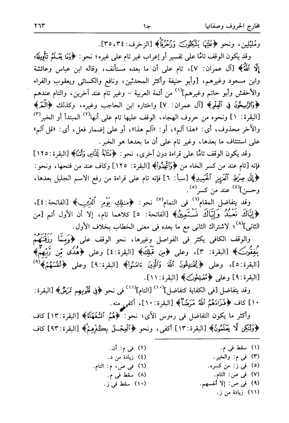 وقد يكون الوقف تامّا على تفسير أو إعراب غير تام على غيره؛ نحو: وَما يَعْلَمُ تَأْوِيلَهُ إِلَّا اللَّهُ [آل عمران: 7]، تام على أن ما بعده مستأنف، وقاله ابن عباس وعائشة وابن مسعود وغيرهم، [وأبو حنيفة وأكثر المحدثين، ونافع والكسائى ويعقوب والفراء والأخفش وأبو حاتم وغيرهم] (¬1) من أئمة العربية- وغير تام عند آخرين، والتام عندهم وَالرَّاسِخُونَ فِي الْعِلْمِ [آل عمران: 7] واختاره ابن الحاجب وغيره، وكذلك الم [البقرة: 1] ونحوه من حروف الهجاء، الوقف عليها تام على أنها (¬2) المبتدأ أو الخبر (¬3) والآخر محذوف، أى: «هذا آلم»، أو: «الم هذا»، أو على إضمار فعل، أى: «قل الم» على استئناف ما بعدها، وغير تام على أن ما بعدها هو الخبر.