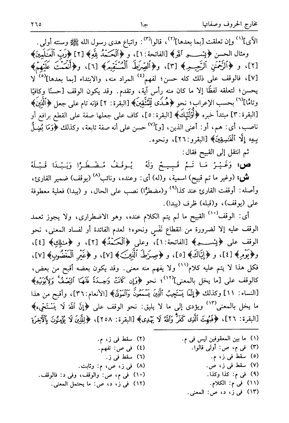 أى: الوقف (¬10) القبيح ما لم يتم الكلام عنده، وهو الاضطرارى، ولا يجوز تعمد الوقف عليه إلا لضرورة من انقطاع نفس ونحوه؛ لعدم الفائدة أو لفساد المعنى، نحو الوقف على بِسْمِ [الفاتحة: 1]، وعلى الْحَمْدُ [2]، ومالِكِ [4]، ويَوْمِ [4]، وإِيَّاكَ [5]، وصِراطَ الَّذِينَ [7]، وغَيْرِ الْمَغْضُوبِ [7]، فكل هذا لا يتم عليه كلام (¬11) ولا يفهم منه معنى. وقد يكون بعضه أقبح من بعض، كالوقف على [ما يخل بالمعنى] (¬12)؛ نحو وَإِنْ كانَتْ واحِدَةً فَلَهَا النِّصْفُ وَلِأَبَوَيْهِ [النساء: 11] وكذلك إِنَّما يَسْتَجِيبُ الَّذِينَ يَسْمَعُونَ وَالْمَوْتى [الأنعام: 36]، وأقبح من هذا ما يخل بالمعنى (¬13) ويؤدى إلى ما لا يليق: نحو الوقف على إِنَّ اللَّهَ لا يَسْتَحْيِي [البقرة: 26]، فَبُهِتَ الَّذِي كَفَرَ وَاللَّهُ لا يَهْدِي [البقرة: 258]، لِلَّذِينَ لا يُؤْمِنُونَ بِالْآخِرَةِ
