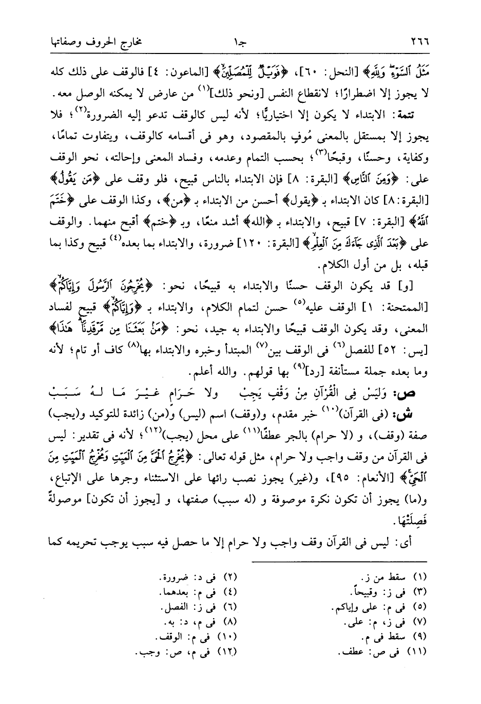 ش: (فى القرآن) (¬10) خبر مقدم، و (وقف) اسم (ليس) و (من) زائدة للتوكيد و (يجب) صفة (وقف)، و (لا حرام) بالجر عطفا (¬11) على محل (يجب) (¬12)؛ لأنه فى تقدير: ليس فى القرآن من وقف واجب ولا حرام، مثل قوله تعالى: يُخْرِجُ الْحَيَّ مِنَ الْمَيِّتِ وَمُخْرِجُ الْمَيِّتِ مِنَ الْحَيِّ [الأنعام: 95]، و (غير) يجوز نصب رائها على الاستثناء وجرها على الإتباع، و (ما) يجوز أن تكون نكرة موصوفة و (له سبب) صفتها، و [يجوز أن تكون] موصولة فصلتها.