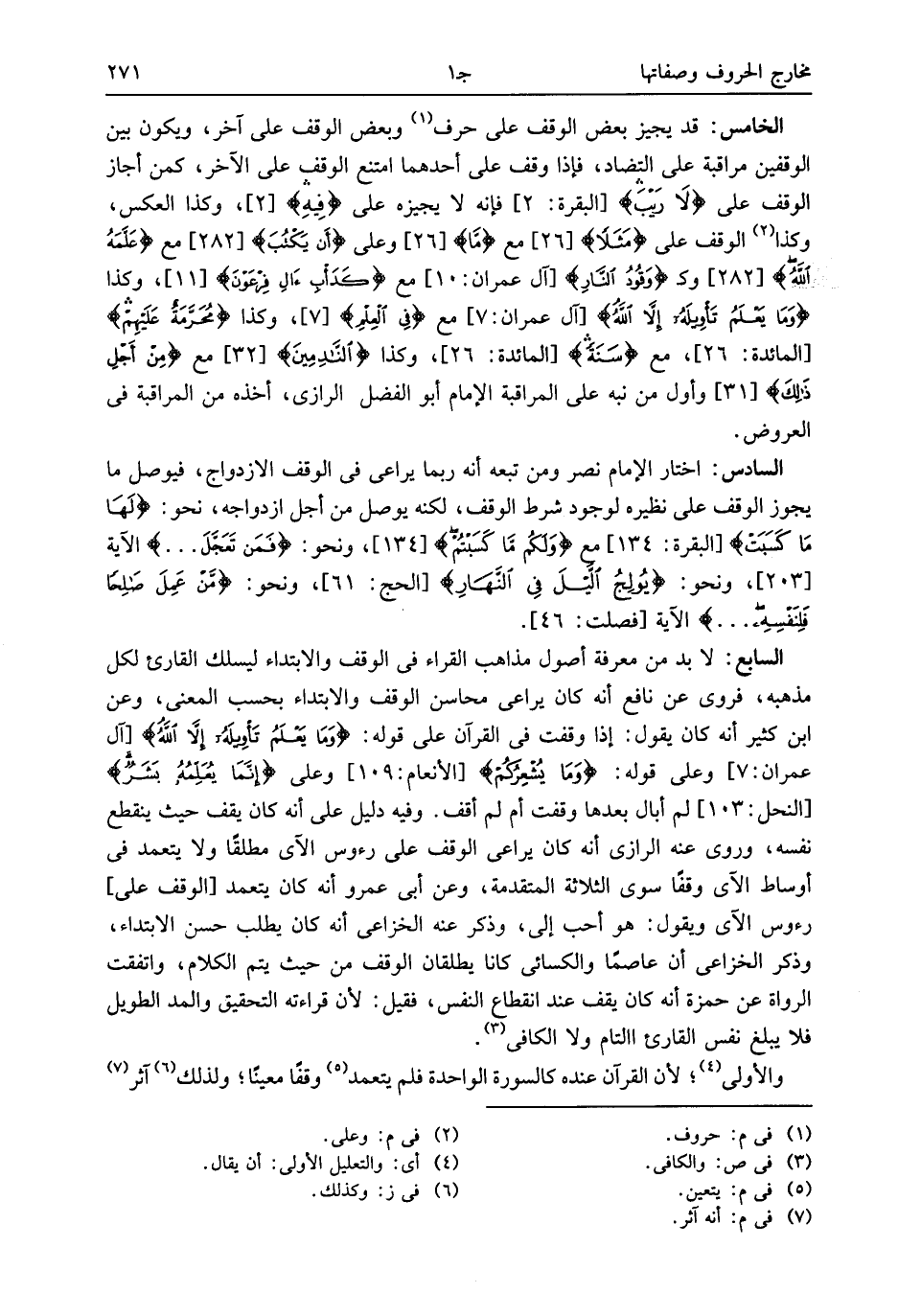 الخامس: قد يجيز بعض الوقف على حرف (¬1) وبعض الوقف على آخر، ويكون بين الوقفين مراقبة على التضاد، فإذا وقف على أحدهما امتنع الوقف على الآخر، كمن أجاز الوقف على لا رَيْبَ [البقرة: 2] فإنه لا يجيزه على فِيهِ [2]، وكذا العكس، وكذا (¬2) الوقف على مَثَلًا [26] مع ما [26] وعلى أَنْ يَكْتُبَ [282] مع عَلَّمَهُ اللَّهُ [282] وك وَقُودُ النَّارِ [آل عمران: 10] مع كَدَأْبِ آلِ فِرْعَوْنَ [11]، وكذا وَما يَعْلَمُ تَأْوِيلَهُ إِلَّا اللَّهُ [آل عمران: 7] مع فِي الْعِلْمِ [7]، وكذا مُحَرَّمَةٌ عَلَيْهِمْ [المائدة: 26]، مع سَنَةً [المائدة: 26]، وكذا النَّادِمِينَ [32] مع مِنْ أَجْلِ ذلِكَ [31] وأول من نبه على المراقبة الإمام أبو الفضل الرازى، أخذه من المراقبة فى العروض.