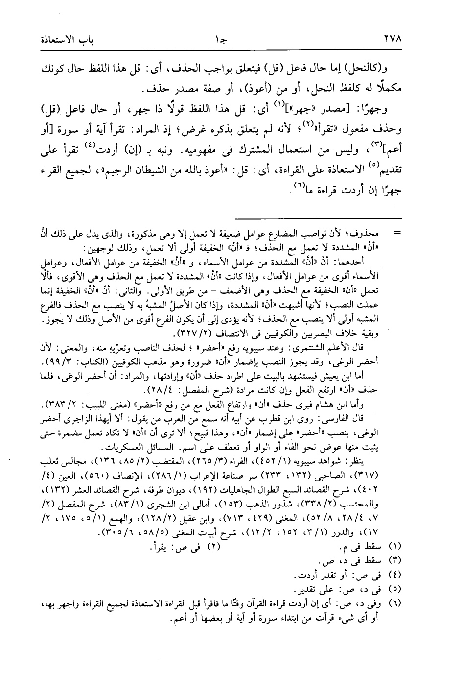 (¬6) وفى د، ص: أى إن أردت قراءة القرآن وقتا ما فاقرأ قبل القراءة الاستعاذة لجميع القراءة واجهر بها، أو أى شىء قرأت من ابتداء سورة أو آية أو بعضها أو أعم.