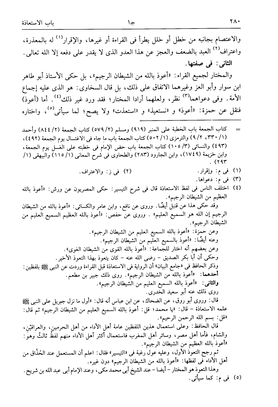 ثم رجح التعوذ الأول، وعليه عول رغبة فى «التيسير» فقال: اعلم أن المستعمل عند الحذّاق من أهل الأداء فى لفظها: «أعوذ بالله من الشيطان الرجيم» دون غيره.