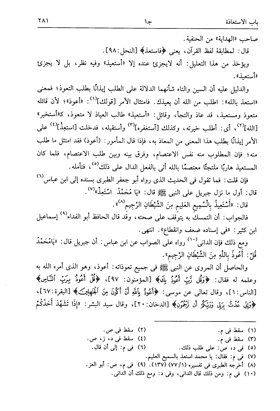 والحاصل أن المروى عن النبى صلى الله عليه وسلم فى جميع تعوذاته: أعوذ، وهو الذى أمره الله به وعلمه له فقال: وَقُلْ رَبِّ أَعُوذُ بِكَ [المؤمنون: 97]، قُلْ أَعُوذُ بِرَبِّ النَّاسِ [الناس: 1]، وقال تعالى عن موسى: أَعُوذُ بِاللَّهِ أَنْ أَكُونَ مِنَ الْجاهِلِينَ [البقرة: 67]، وَإِنِّي عُذْتُ بِرَبِّي وَرَبِّكُمْ أَنْ تَرْجُمُونِ [الدخان: 20]، وقال سيد البشر: «إذا تشهّد أحدكم
