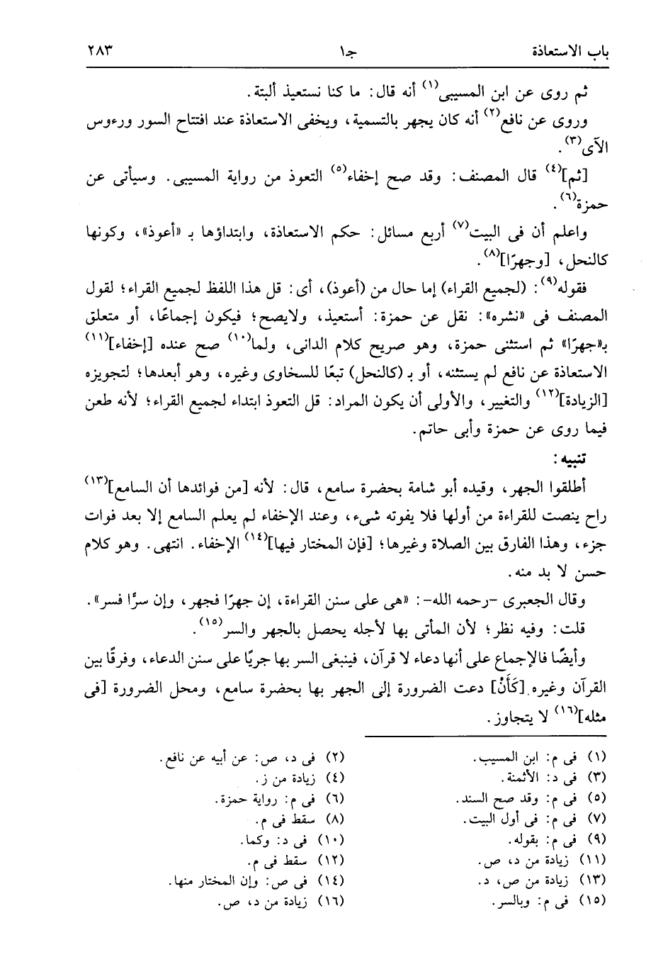 فقوله (¬9): (لجميع القراء) إما حال من (أعوذ)، أى: قل هذا اللفظ لجميع القراء؛ لقول المصنف فى «نشره»: نقل عن حمزة: أستعيذ، ولا يصح؛ فيكون إجماعا، أو متعلق ب «جهرا» ثم استثنى حمزة، وهو صريح كلام الدانى، ولما (¬10) صح عنده [إخفاء] (¬11) الاستعاذة عن نافع لم يستثنه، أو ب (كالنحل) تبعا للسخاوى وغيره، وهو أبعدها؛ لتجويزه [الزيادة] (¬12) والتغيير، والأولى أن يكون المراد: قل التعوذ ابتداء لجميع القراء؛ لأنه طعن فيما روى عن حمزة وأبى حاتم.