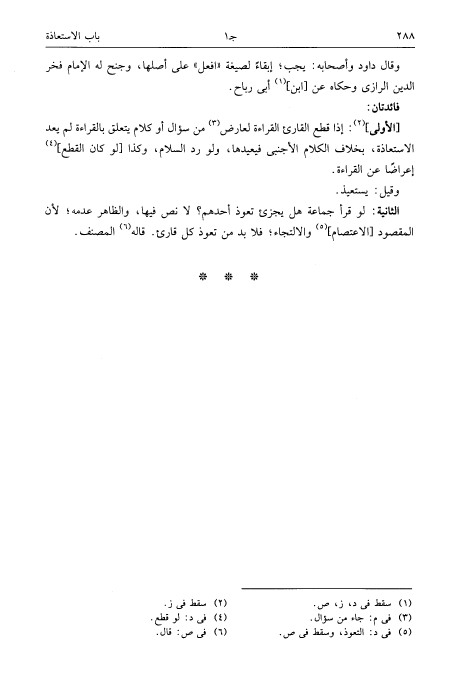[الأولى] (¬2): إذا قطع القارئ القراءة لعارض (¬3) من سؤال أو كلام يتعلق بالقراءة لم يعد الاستعاذة، بخلاف الكلام الأجنبى فيعيدها، ولو رد السلام، وكذا [لو كان القطع] (¬4) إعراضا عن القراءة.
