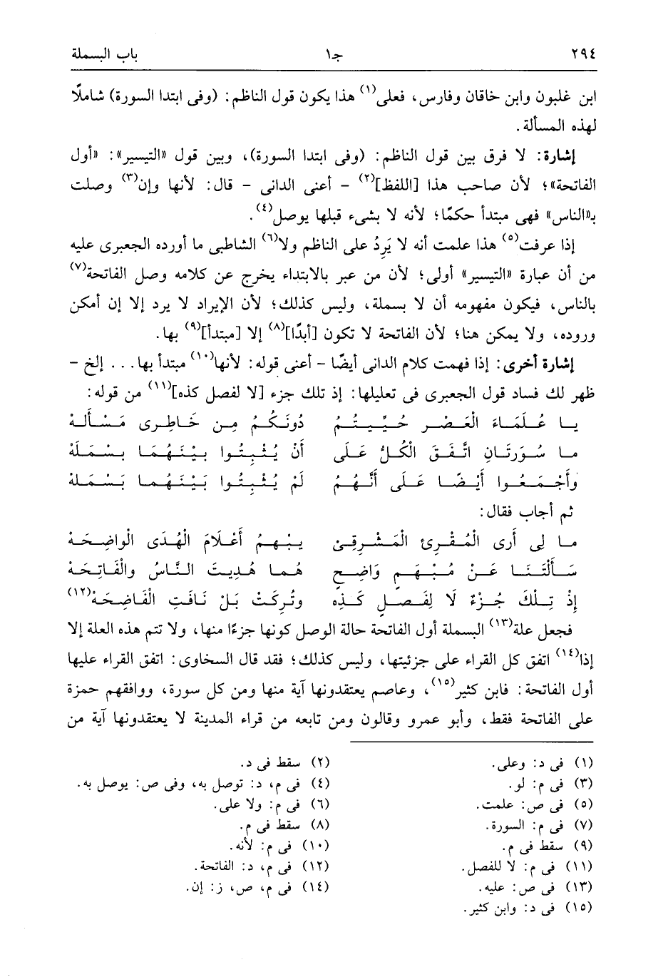 فجعل علة (¬13) البسملة أول الفاتحة حالة الوصل كونها جزءا منها، ولا تتم هذه العلة إلا إذا (¬14) اتفق كل القراء على جزئيتها، وليس كذلك؛ فقد قال السخاوى: اتفق القراء عليها أول الفاتحة: فابن كثير (¬15)، وعاصم يعتقدونها آية منها ومن كل سورة، ووافقهم حمزة على الفاتحة فقط، وأبو عمرو وقالون ومن تابعه من قراء المدينة لا يعتقدونها آية من