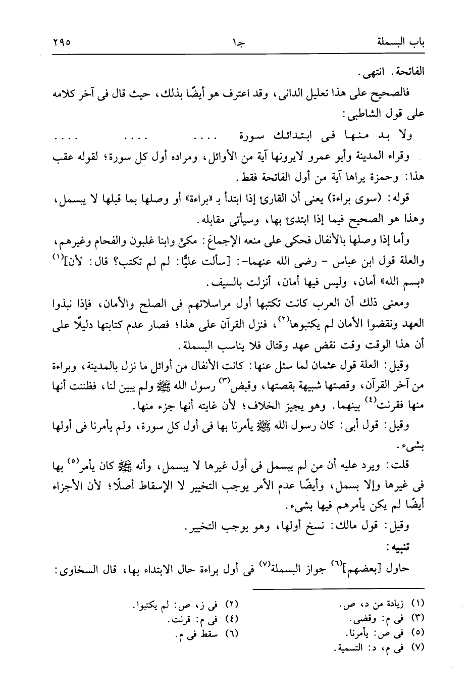 قلت: ويرد عليه أن من لم يبسمل فى أول غيرها لا يبسمل، وأنه صلى الله عليه وسلم كان يأمر (¬5) بها فى غيرها وإلا بسمل، وأيضا عدم الأمر يوجب التخيير لا الإسقاط أصلا؛ لأن الأجزاء أيضا لم يكن يأمرهم فيها بشيء.
