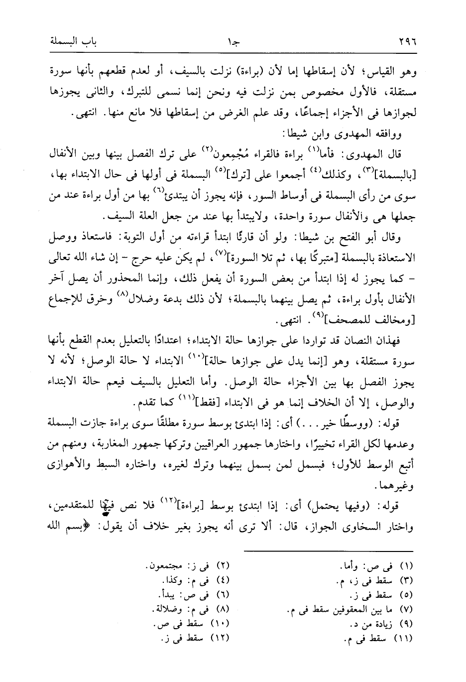فهذان النصان قد تواردا على جوازها حالة الابتداء؛ اعتدادا بالتعليل بعدم القطع بأنها سورة مستقلة، وهو [إنما يدل على جوازها حالة] (¬10) الابتداء لا حالة الوصل؛ لأنه لا يجوز الفصل بها بين الأجزاء حالة الوصل. وأما التعليل بالسيف فيعم حالة الابتداء والوصل، إلا أن الخلاف إنما هو فى الابتداء [فقط] (¬11) كما تقدم.