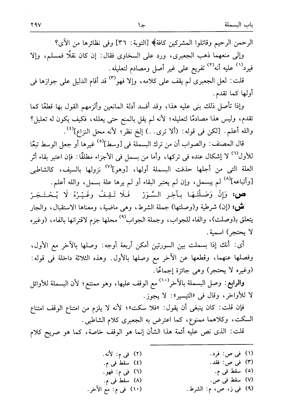 قال المصنف: والصواب أن من ترك البسملة فى [وسط] (¬5) غيرها أو جعل الوسط تبعا للأول (¬6) لا إشكال عنده فى تركها، وأما من بسمل فى الأجزاء مطلقا: فإن اعتبر بقاء أثر العلة التى من أجلها حذفت البسملة أولها، [وهو] (¬7) نزولها بالسيف، كالشاطبى [وأتباعه] (¬8) لم يبسمل، وإن لم يعتبر البقاء أو لم يرها علة بسمل، والله أعلم.