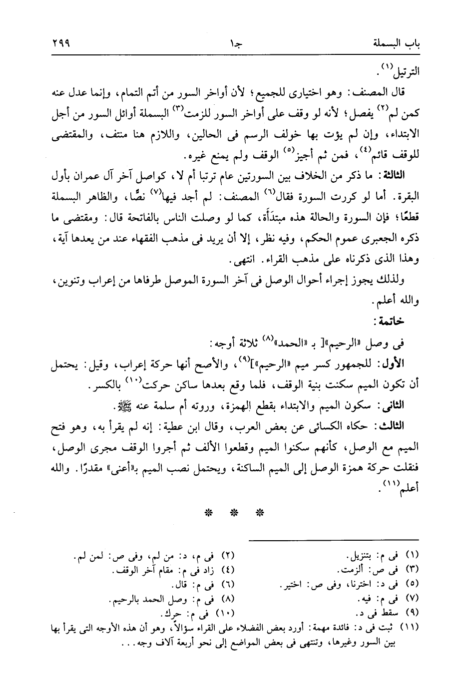 (¬11) ثبت فى د: فائدة مهمة: أورد بعض الفضلاء على القراء سؤالا، وهو أن هذه الأوجه التى يقرأ بها بين السور وغيرها، وتنتهى فى بعض المواضع إلى نحو أربعة آلاف وجه ...