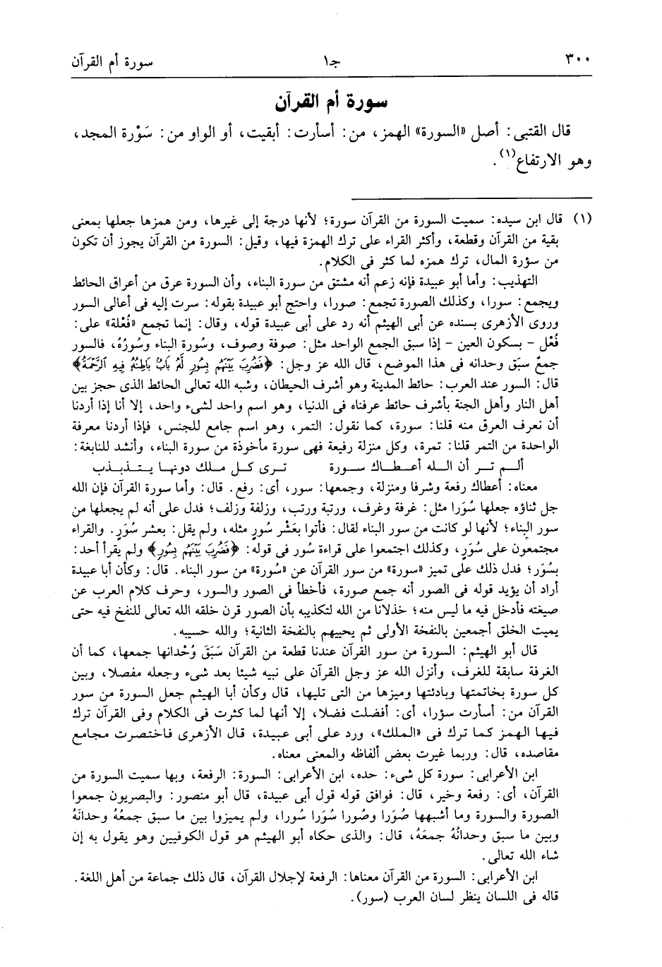 قال أبو الهيثم: السورة من سور القرآن عندنا قطعة من القرآن سبق وحدانها جمعها، كما أن الغرفة سابقة للغرف، وأنزل الله عز وجل القرآن على نبيه شيئا بعد شىء وجعله مفصلا، وبين كل سورة بخاتمتها وبادئتها وميزها من التى تليها، قال وكأن أبا الهيثم جعل السورة من سور القرآن من: أسأرت سؤرا، أى: أفضلت فضلا، إلا أنها لما كثرت فى الكلام وفى القرآن ترك فيها الهمز كما ترك فى «الملك»، ورد على أبى عبيدة، قال الأزهرى فاختصرت مجامع مقاصده، قال: وربما غيرت بعض ألفاظه والمعنى معناه.