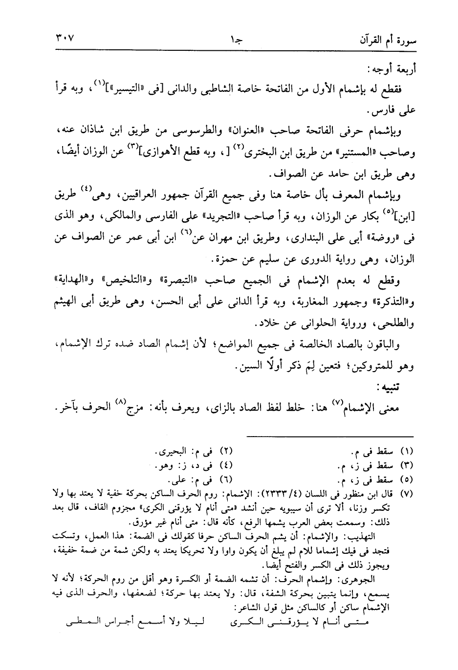 وبإشمام حرفى الفاتحة صاحب «العنوان» والطرسوسى من طريق ابن شاذان عنه، وصاحب «المستنير» من طريق ابن البخترى (¬2) [، وبه قطع الأهوازى] (¬3) عن الوزان أيضا، وهى طريق ابن حامد عن الصواف.