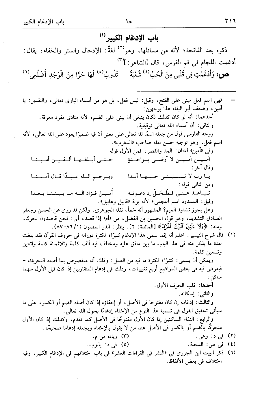 والثالث: إدغامه إن كان مفتوحا فى الأصل، أو إخفاؤه إذا كان أصله الضم أو الكسر، على ما سيأتى تحقيق القول فى تسمية هذا النوع من الإخفاء إدغاما بحول الله تعالى.