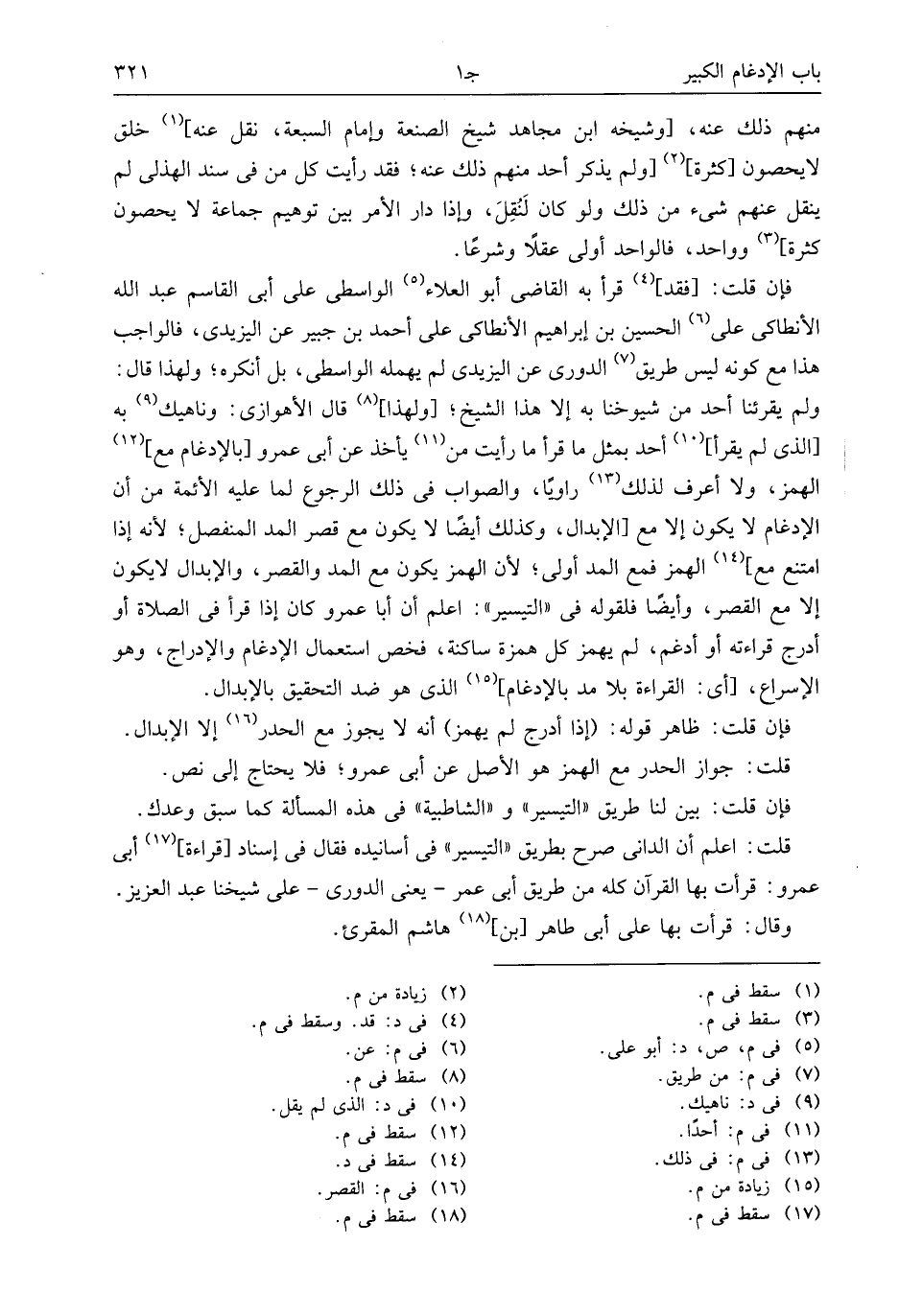 ولم يقرئنا أحد من شيوخنا به إلا هذا الشيخ؛ [ولهذا] (¬8) قال الأهوازى: وناهيك (¬9) به [الذى لم يقرأ] (¬10) أحد بمثل ما قرأ ما رأيت من (¬11) يأخذ عن أبى عمرو [بالإدغام مع] (¬12) الهمز، ولا أعرف لذلك (¬13) راويا، والصواب فى ذلك الرجوع لما عليه الأئمة من أن الإدغام لا يكون إلا مع [الإبدال، وكذلك أيضا لا يكون مع قصر المد المنفصل؛ لأنه إذا امتنع مع] (¬14) الهمز فمع المد أولى؛ لأن الهمز يكون مع المد والقصر، والإبدال لا يكون إلا مع القصر، وأيضا فلقوله فى «التيسير»: اعلم أن أبا عمرو كان إذا قرأ فى الصلاة أو أدرج قراءته أو أدغم، لم يهمز كل همزة ساكنة، فخص استعمال الإدغام والإدراج، وهو الإسراع، [أى: القراءة بلا مد بالإدغام] (¬15) الذى هو ضد التحقيق بالإبدال.