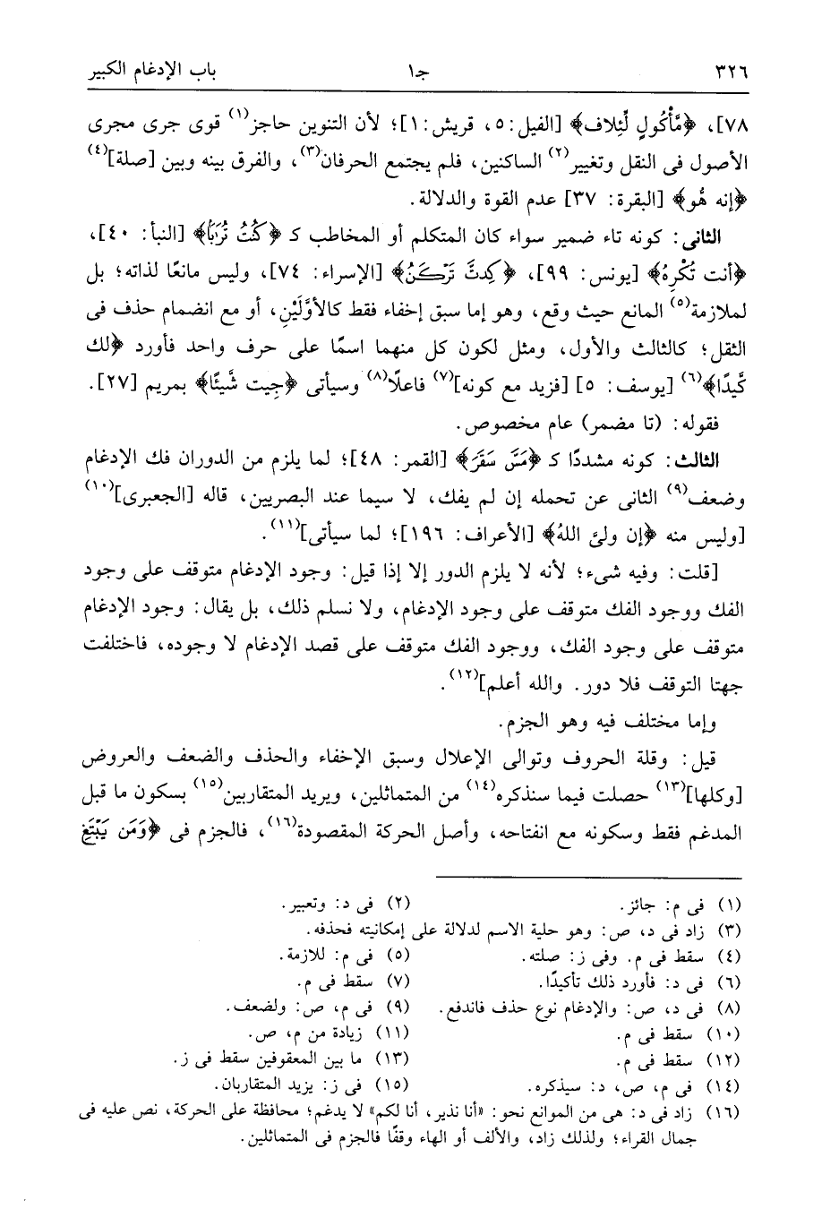 (¬16) زاد فى د: هى من الموانع نحو: «أنا نذير، أنا لكم» لا يدغم؛ محافظة على الحركة، نص عليه فى جمال القراء؛ ولذلك زاد، والألف أو الهاء وقفا فالجزم فى المتماثلين.