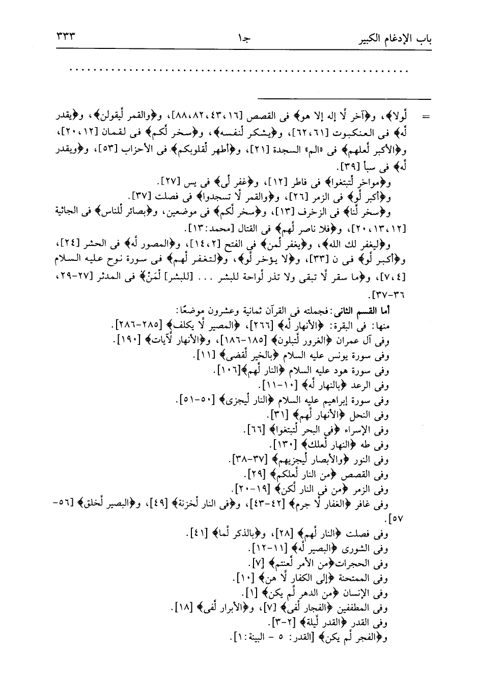 لَوْلا، وآخَرَ لا إِلهَ إِلَّا هُوَ فى القصص [16، 43، 82، 88]، ووَ الْقَمَرَ لَيَقُولُنَّ، ويَقْدِرُ لَهُ فى العنكبوت [61، 62]، ويَشْكُرُ لِنَفْسِهِ، وسَخَّرَ لَكُمْ فى لقمان [12، 20]، والْأَكْبَرِ لَعَلَّهُمْ فى «الم» السجدة [21]، وأَطْهَرُ لِقُلُوبِكُمْ فى الأحزاب [53]، ووَ يَقْدِرُ لَهُ فى سبأ [39].