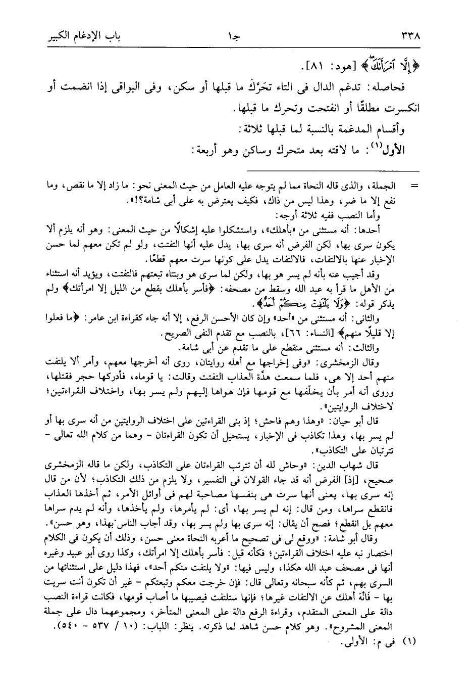 وقال أبو شامة: «ووقع لى فى تصحيح ما أعربه النحاة معنى حسن، وذلك أن يكون فى الكلام اختصار نبه عليه اختلاف القراءتين؛ فكأنه قيل: فأسر بأهلك إلا امرأتك، وكذا روى أبو عبيد وغيره أنها فى مصحف عبد الله هكذا، وليس فيها: «ولا يلتفت منكم أحد»، فهذا دليل على استثنائها من السرى بهم، ثم كأنه سبحانه وتعالى قال: فإن خرجت معكم وتبعتكم- غير أن تكون أنت سريت بها- فانه أهلك عن الالتفات غيرها؛ فإنها ستلتفت فيصيبها ما أصاب قومها، فكانت قراءة النصب دالة على المعنى المتقدم، وقراءة الرفع دالة على المعنى المتأخر، ومجموعهما دال على جملة المعنى المشروح». وهو كلام حسن شاهد لما ذكرته. ينظر: اللباب: (10/ 537 - 540).