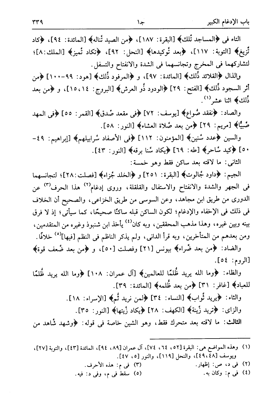 التاء فى الْمَساجِدِ تِلْكَ [البقرة: 187]، مِنَ الصَّيْدِ تَنالُهُ [المائدة: 94]، كاد تزيغ [التوبة: 117]، بَعْدَ تَوْكِيدِها [النحل: 92]، تَكادُ تَمَيَّزُ [الملك: 8]؛ لتشاركهما فى المخرج وتجانسهما فى الشدة والانفتاح والتسفل.