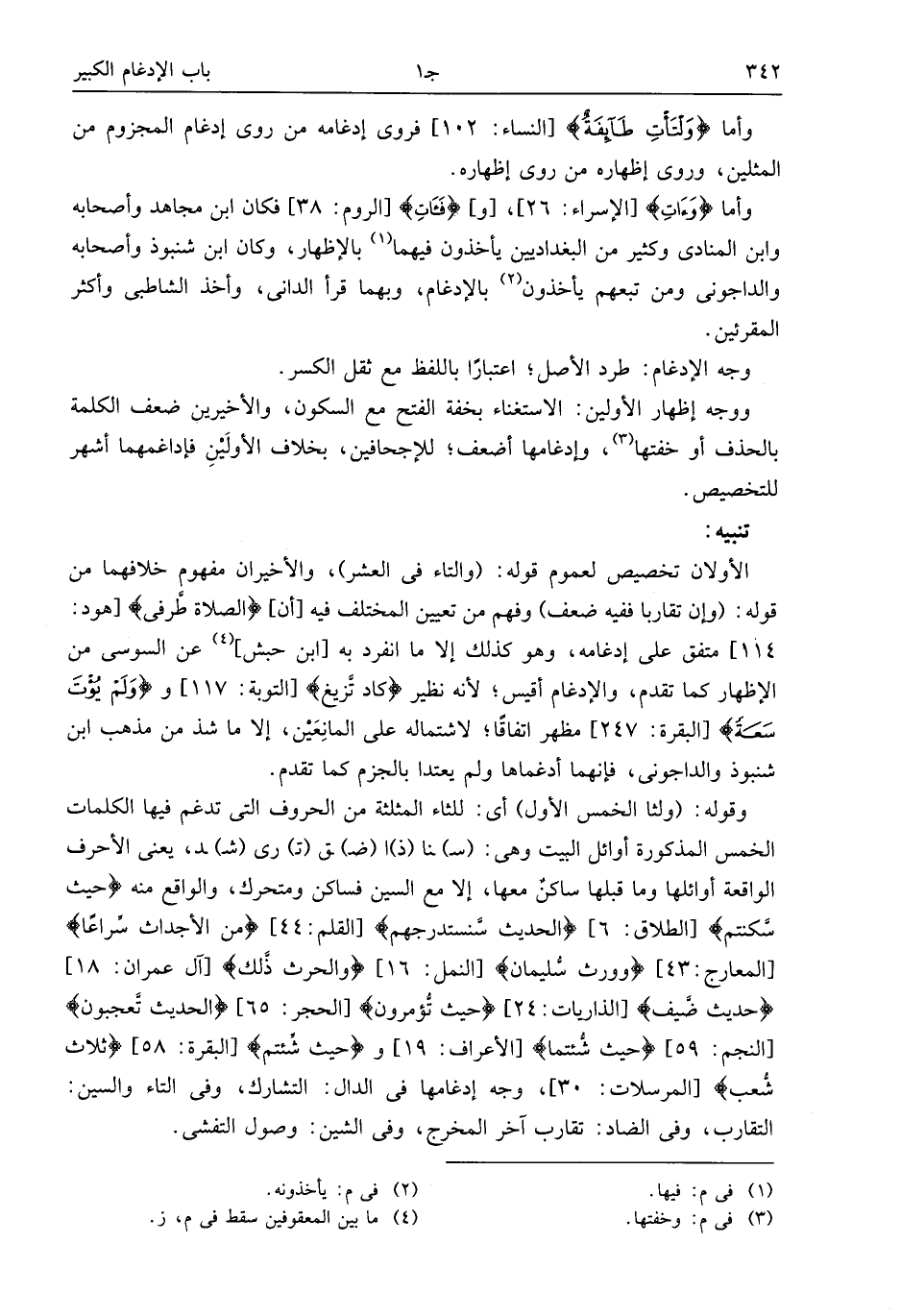 114] متفق على إدغامه، وهو كذلك إلا ما انفرد به [ابن حبش] (¬4) عن السوسى من الإظهار كما تقدم، والإدغام أقيس؛ لأنه نظير كاد تزيغ [التوبة: 117] ووَ لَمْ يُؤْتَ سَعَةً [البقرة: 247] مظهر اتفاقا؛ لاشتماله على المانعين، إلا ما شذ من مذهب ابن شنبوذ والداجونى، فإنهما أدغماها ولم يعتدا بالجزم كما تقدم.