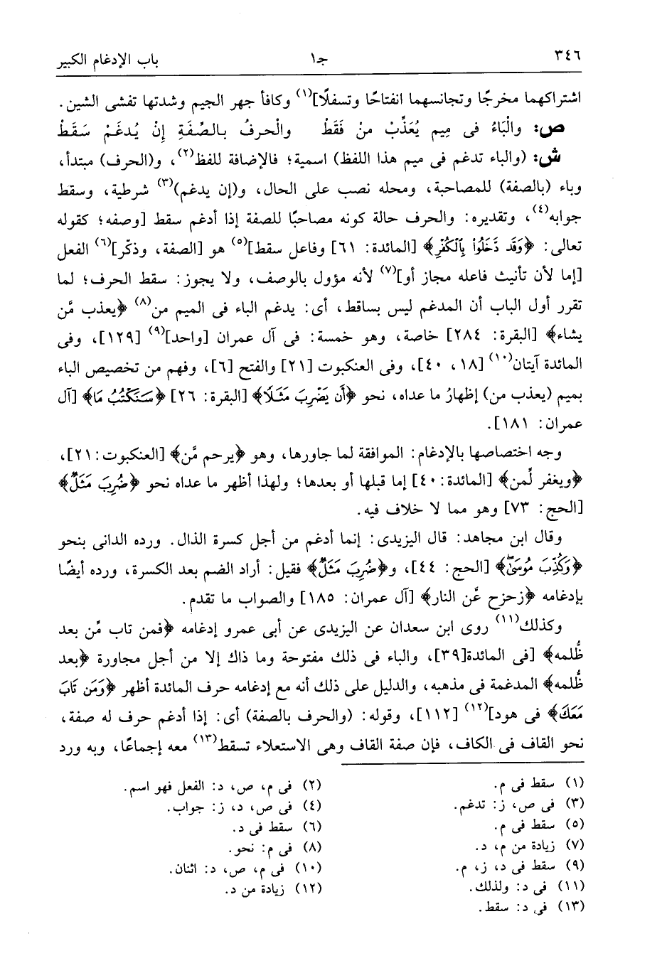 ش: (والباء تدغم فى ميم هذا اللفظ) اسمية؛ فالإضافة للفظ (¬2)، و (الحرف) مبتدأ، وباء (بالصفة) للمصاحبة، ومحله نصب على الحال، و (إن يدغم) (¬3) شرطية، وسقط جوابه (¬4)، وتقديره: والحرف حالة كونه مصاحبا للصفة إذا أدغم سقط [وصفه؛ كقوله تعالى: وَقَدْ دَخَلُوا بِالْكُفْرِ [المائدة: 61] وفاعل سقط] (¬5) هو [الصفة، وذكّر] (¬6) الفعل [إما لأن تأنيث فاعله مجاز أو] (¬7) لأنه مؤول بالوصف، ولا يجوز: سقط الحرف؛ لما تقرر أول الباب أن المدغم ليس بساقط، أى: يدغم الباء فى الميم من (¬8) يُعَذِّبُ مَنْ يَشاءُ [البقرة: 284] خاصة، وهو خمسة: فى آل عمران [واحد] (¬9) [129]، وفى المائدة آيتان (¬10) [18، 40]، وفى العنكبوت [21] والفتح [6]، وفهم من تخصيص الباء بميم (يعذب من) إظهار ما عداه، نحو أَنْ يَضْرِبَ مَثَلًا [البقرة: 26] سَنَكْتُبُ ما [آل عمران: 181].
