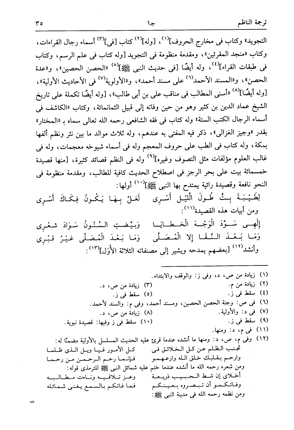 التجويد» وكتاب فى مخارج الحروف] (¬1)، [وله] (¬2) كتاب [فى] (¬3) أسماء رجال القراءات، وكتاب «منجد المقرئين»، ومقدمة منظومة فى التجويد [وله كتاب فى علم الرسم، وكتاب فى طبقات القراء] (¬4)، وله أيضا [فى حديث النبى صلى الله عليه وسلم] (¬5) «الحصن الحصين»، و «عدة الحصن»، و «المسند الأحمد (¬6) على مسند أحمد»، و «الأولوية (¬7) فى الأحاديث الأولية»، [وله أيضا] (¬8) «أسنى المطالب فى مناقب على بن أبى طالب»، [وله أيضا تكملة على تاريخ الشيخ عماد الدين بن كثير وهو من حين وفاته إلى قبيل الثمانمائة، وكتاب «الكاشف فى أسماء الرجال الكتب الستة» وله كتاب فى فقه الشافعى رحمه الله تعالى سماه ب «المختار» بقدر «وجيز الغزالى»، ذكر فيه المفتى به عندهم، وله ثلاث موالد ما بين نثر ونظم ألفها بمكة، وله كتاب فى الطب على حروف المعجم وله فى أسماء شيوخه معجمات، وله فى غالب العلوم مؤلفات مثل التصوف وغيره] (¬9) وله فى النظم قصائد كثيرة، [منها قصيدة خمسمائة بيت على بحر الرجز فى اصطلاح الحديث كافية للطالب، ومقدمة منظومة فى النحو نافعة وقصيدة رائية يمتدح بها النبى صلى الله عليه وسلم] (¬10) أولها: