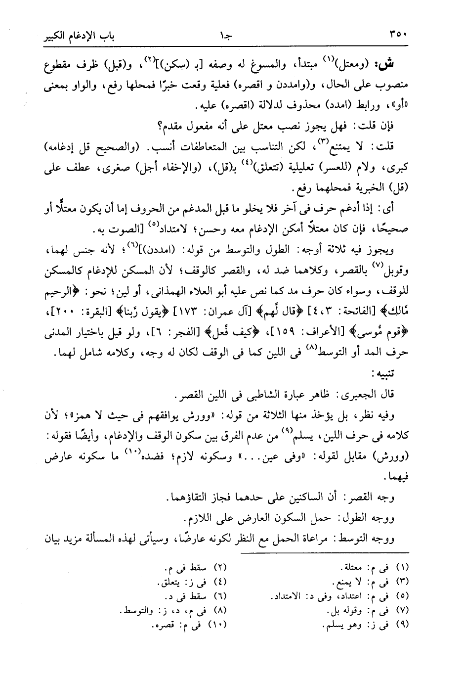 ويجوز فيه ثلاثة أوجه: الطول والتوسط من قوله: (امددن)] (¬6)؛ لأنه جنس لهما، وقوبل (¬7) بالقصر، وكلاهما ضد له، والقصر كالوقف؛ لأن المسكن للإدغام كالمسكن للوقف، وسواء كان حرف مد كما نص عليه أبو العلاء الهمذانى، أو لين؛ نحو: الرَّحِيمِ مالِكِ [الفاتحة: 3، 4] قالَ لَهُمُ [آل عمران: 173] يَقُولُ رَبَّنا [البقرة: 200]، قَوْمِ مُوسى [الأعراف: 159]، كَيْفَ فَعَلَ [الفجر: 6]، ولو قيل باختيار المدنى حرف المد أو التوسط (¬8) فى اللين كما فى الوقف لكان له وجه، وكلامه شامل لهما.