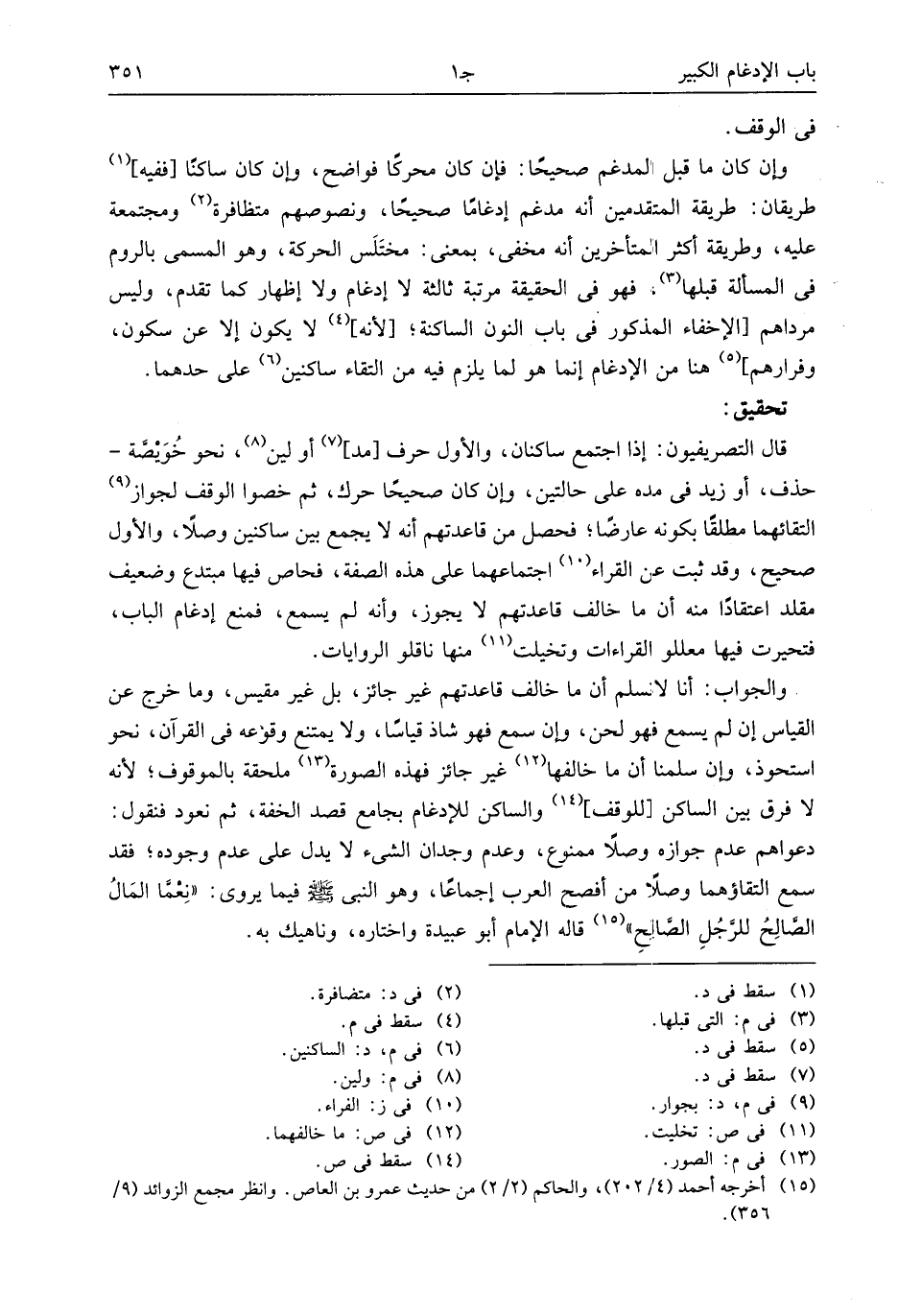 قال التصريفيون: إذا اجتمع ساكنان، والأول حرف [مد] (¬7) أو لين (¬8)، نحو خويصّة- حذف، أو زيد فى مده على حالتين، وإن كان صحيحا حرك، ثم خصوا الوقف لجواز (¬9) التقائهما مطلقا بكونه عارضا؛ فحصل من قاعدتهم أنه لا يجمع بين ساكنين وصلا، والأول صحيح، وقد ثبت عن القراء (¬10) اجتماعهما على هذه الصفة، فحاص فيها مبتدع وضعيف مقلد اعتقادا منه أن ما خالف قاعدتهم لا يجوز، وأنه لم يسمع، فمنع إدغام الباب، فتحيرت فيها معللو القراءات وتخيلت (¬11) منها ناقلو الروايات.