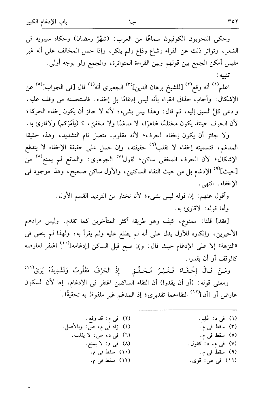 [فقد] قلنا: ممنوع، كيف وهو طريقة أكثر المتأخرين كما تقدم. وليس مرادهم الأخيرين، وإنكاره للأول يدل على أنه لم يطلع عليه ولم يقرأ به؛ ولهذا لم ينص فى «النزهة» إلا على الإدغام حيث قال: وإن صح قبل الساكن [إدغامه] (¬10) اغتفر لعارضه كالوقف أو أن يقدرا.