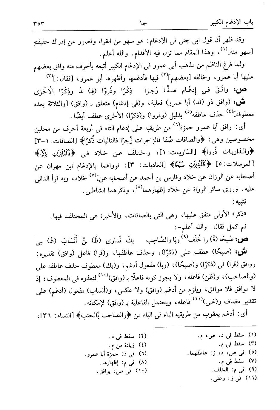 ووافق (قرا) فى (ذكرا) و (صبحا)، (وبا) مفعول أدغم، و (بك) معطوف حذف عاطفه على (والصاحب)، و (ظن) فاعله، ولا يجوز كونه فاعلا ب (وافق) (¬10) لتعذره فى المعطوف؛ إذ لا موافق فلا موافق، ويلزم من أدغم (وافق) ولا عكس، و (أنساب) مفعول (أدغم) على تقدير مضاف و (غبى) (¬11) فاعله، ويحتمل الفاعلية ب (وافق) لإمكانه.