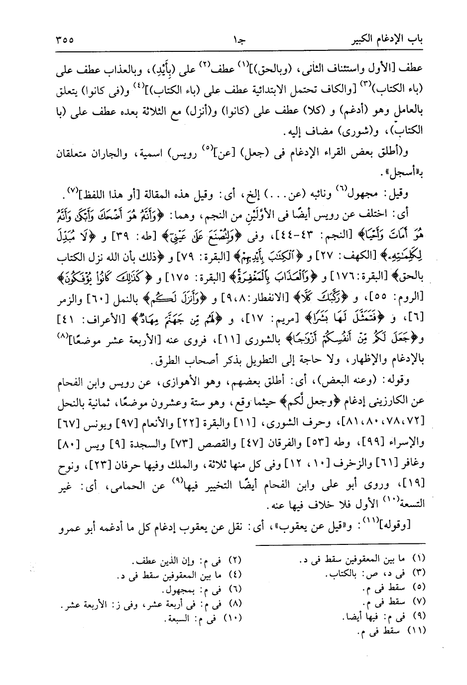 وقوله: (وعنه البعض)، أى: أطلق بعضهم، وهو الأهوازى، عن رويس وابن الفحام عن الكارزينى إدغام وَجَعَلَ لَكُمْ* حيثما وقع، وهو ستة وعشرون موضعا، ثمانية بالنحل [72، 78، 80، 81]، وحرف الشورى، [11] والبقرة [22] والأنعام [97] ويونس [67] والإسراء [99]، وطه [53] والفرقان [47] والقصص [73] والسجدة [9] ويس [80] وغافر [61] والزخرف [10، 12] وفى كل منها ثلاثة، والملك وفيها حرفان [23]، ونوح [19]، وروى أبو على وابن الفحام أيضا التخيير فيها (¬9) عن الحمامى، أى: غير التسعة (¬10) الأول فلا خلاف فيها عنه.