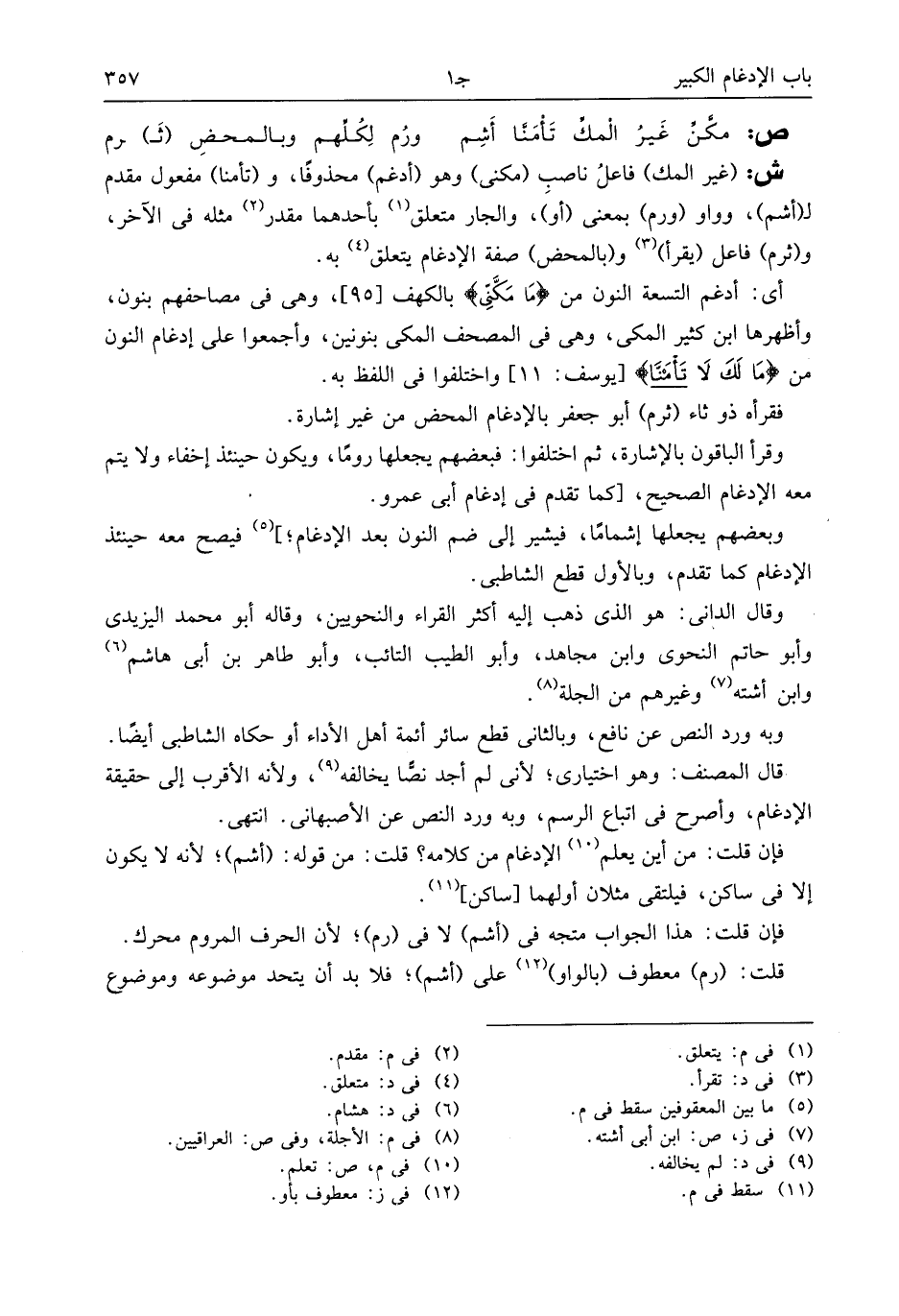 قال المصنف: وهو اختيارى؛ لأنى لم أجد نصّا يخالفه (¬9)، ولأنه الأقرب إلى حقيقة الإدغام، وأصرح فى اتباع الرسم، وبه ورد النص عن الأصبهانى. انتهى.