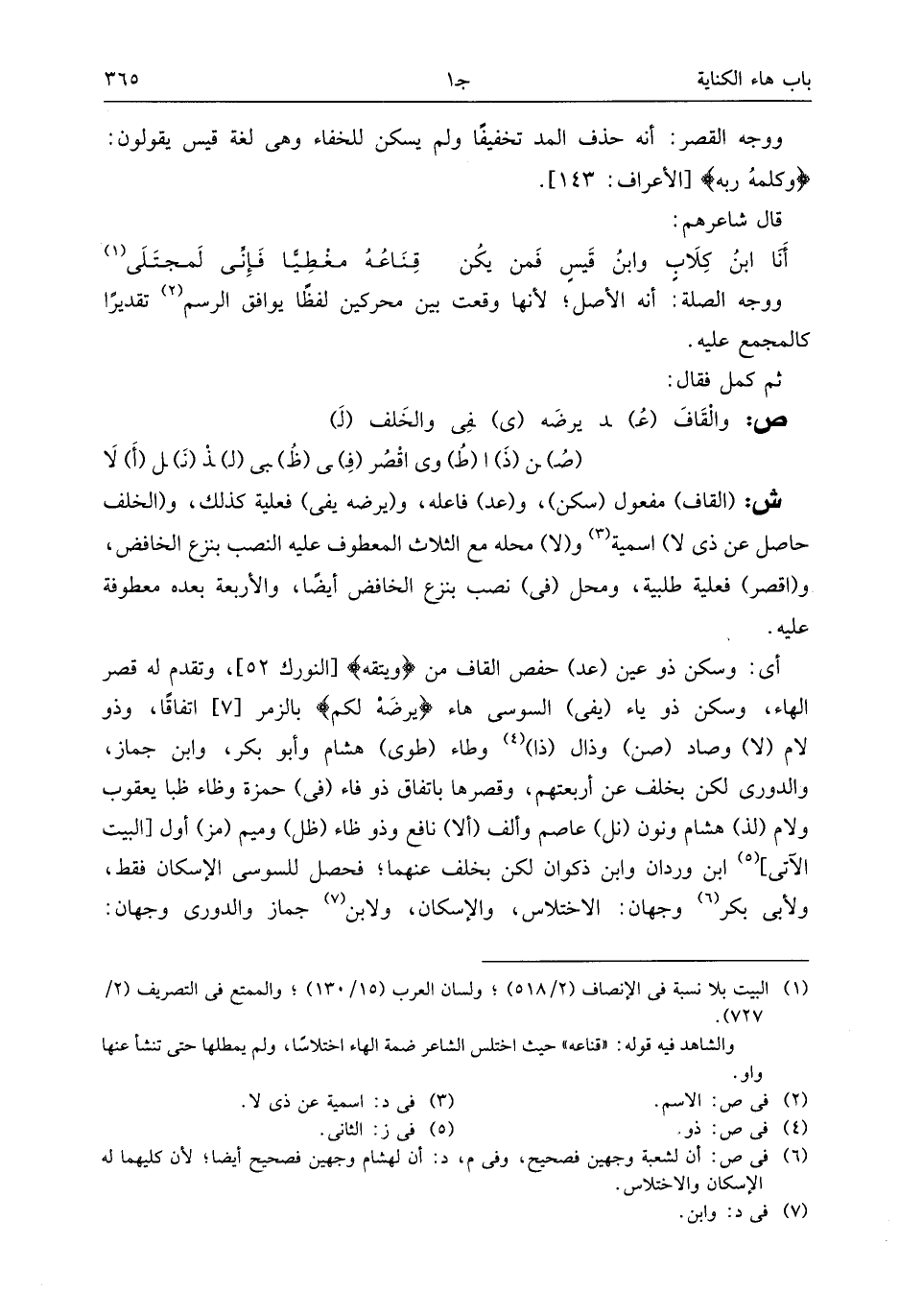 ش: (القاف) مفعول (سكن)، و (عد) فاعله، و (يرضه يفى) فعلية كذلك، و (الخلف حاصل عن ذى لا) اسمية (¬3) و (لا) محله مع الثلاث المعطوف عليه النصب بنزع الخافض، و (اقصر) فعلية طلبية، ومحل (فى) نصب بنزع الخافض أيضا، والأربعة بعده معطوفة عليه.