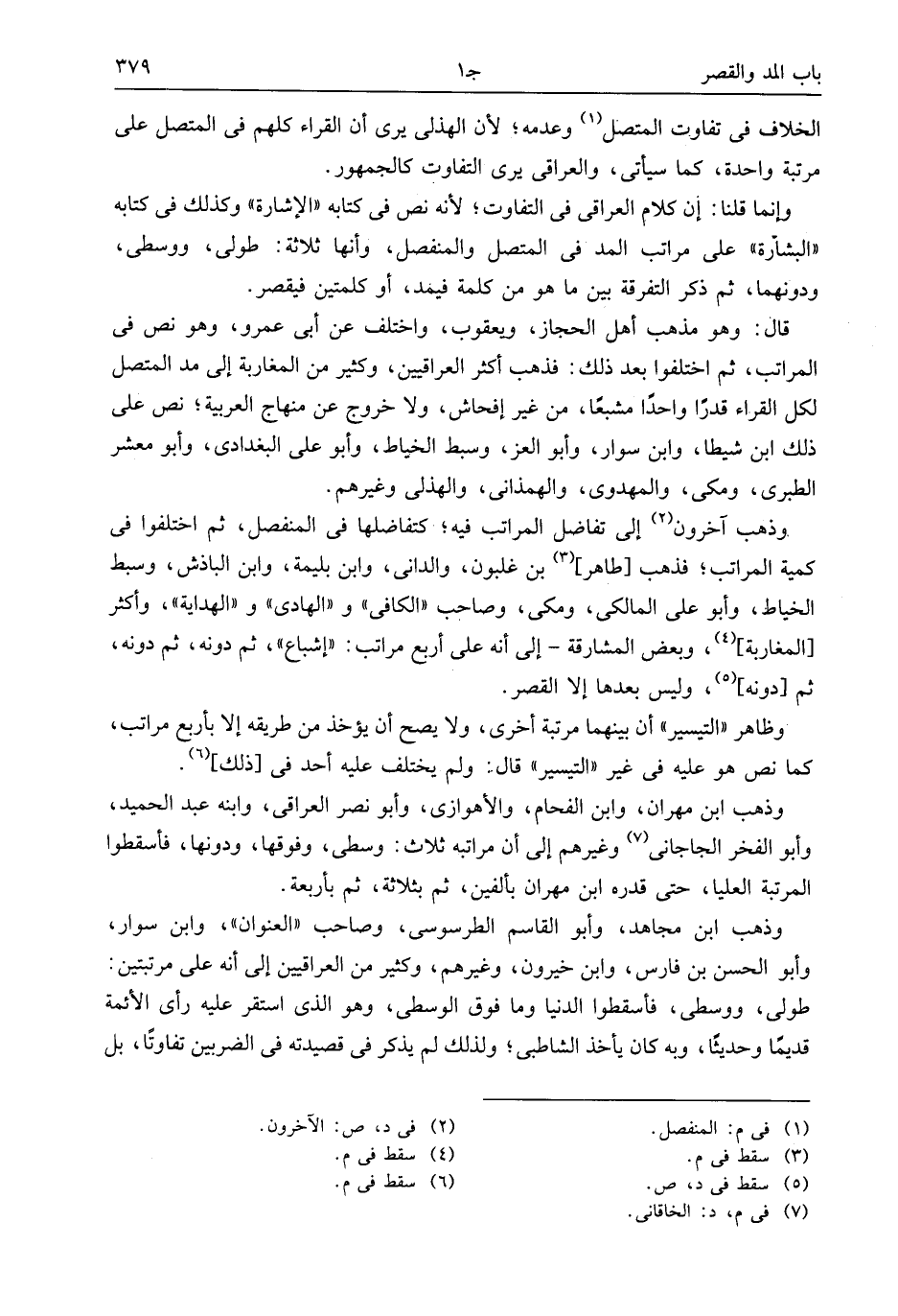 وإنما قلنا: إن كلام العراقى فى التفاوت؛ لأنه نص فى كتابه «الإشارة» وكذلك فى كتابه «البشارة» على مراتب المد فى المتصل والمنفصل، وأنها ثلاثة: طولى، ووسطى، ودونهما، ثم ذكر التفرقة بين ما هو من كلمة فيمد، أو كلمتين فيقصر.