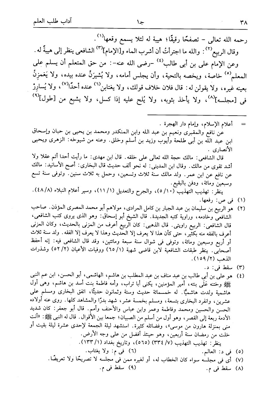 (¬2) هو الربيع بن سليمان بن عبد الجبار بن كامل المرادى، مولاهم أبو محمد المصرى المؤذن. صاحب الشافعى وخادمه، وراوية كتبه الجديدة. قال الشيخ أبو إسحاق: وهو الذى يروى كتب الشافعى، قال الشافعى: الربيع راويتى. قال الذهبى: كان الربيع أعرف من المزنى بالحديث، وكان المزنى أعرف بالفقه منه بكثير، حتى كأن هذا لا يعرف إلا الحديث وهذا لا يعرف إلا الفقه. ولد سنة ثلاث أو أربع وسبعين ومائة، وتوفى فى شوال سنة سبعة ومائتين، وقد قال الشافعى فيه: إنه أحفظ أصحابى. ينظر طبقات الشافعية لابن قاضى شهبة (1/ 65) ووفيات الأعيان (2/ 52) وشذرات الذهب (2/ 159).