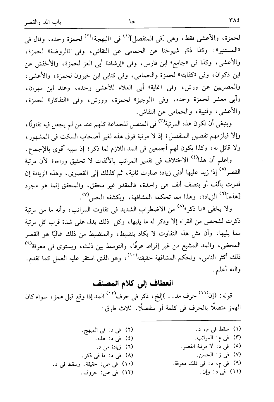 واعلم أن هذا (¬4) الاختلاف فى تقدير المراتب بالألفات لا تحقيق وراءه؛ لأن مرتبة القصر (¬5) إذا زيد عليها أدنى زيادة صارت ثانية، ثم كذلك إلى القصوى، وهذه الزيادة إن قدرت بألف أو بنصف ألف هى واحدة، فالمقدر غير محقق، والمحقق إنما هو مجرد [هذه] (¬6) الزيادة، وهذا مما تحكمه المشافهة، ويكشفه الحس (¬7).