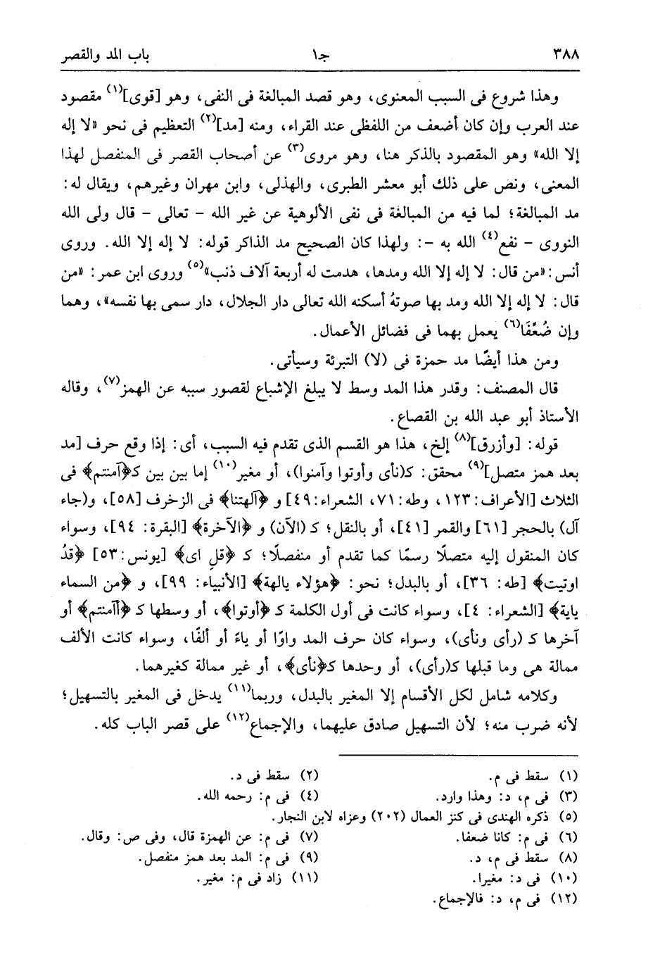 وهذا شروع فى السبب المعنوى، وهو قصد المبالغة فى النفى، وهو [قوى] (¬1) مقصود عند العرب وإن كان أضعف من اللفظى عند القراء، ومنه [مد] (¬2) التعظيم فى نحو لا إله إلا الله» وهو المقصود بالذكر هنا، وهو مروى (¬3) عن أصحاب القصر فى المنفصل لهذا المعنى، ونص على ذلك أبو معشر الطبرى، والهذلى، وابن مهران وغيرهم، ويقال له: