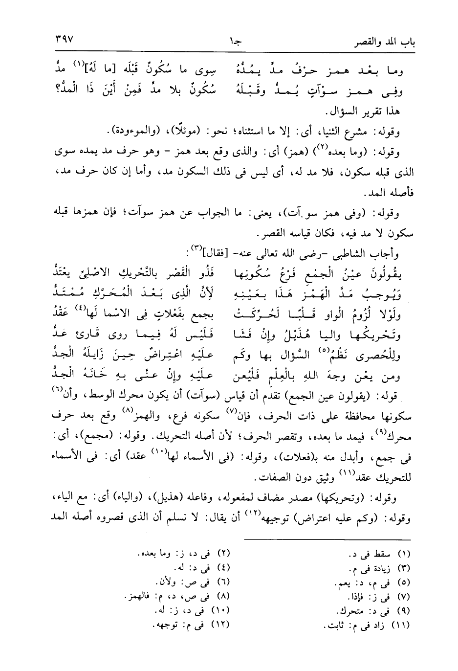 وقوله: (وتحريكها) مصدر مضاف لمفعوله، وفاعله (هذيل)، (والياء) أى: مع الياء، وقوله: (وكم عليه اعتراض) توجيهه (¬12) أن يقال: لا نسلم أن الذى قصروه أصله المد