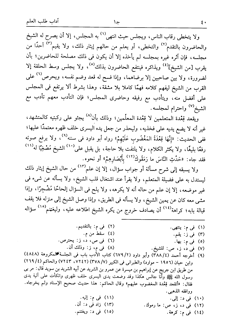 ويقعد قعدة المتعلمين لا قعدة المعلّمين؛ وذلك بأن (¬8) يجثو على ركبتيه كالمتشهد، غير أنه لا يضع يديه على فخذيه، وليحذر من جعل يده اليسرى خلف ظهره معتمدا عليها؛ ففي الحديث: «إنّها قعدة المغضوب عليهم» رواه أبو داود فى سننه (¬9)، ولا يرفع صوته رفعا بليغا، ولا يكثر الكلام، ولا يلتفت بلا حاجة، بل يقبل على (¬10) الشيخ مصغيا له (¬11) فقد جاء: «حدّث النّاس ما رمقوك (¬12) بأبصارهم» أو نحوه.