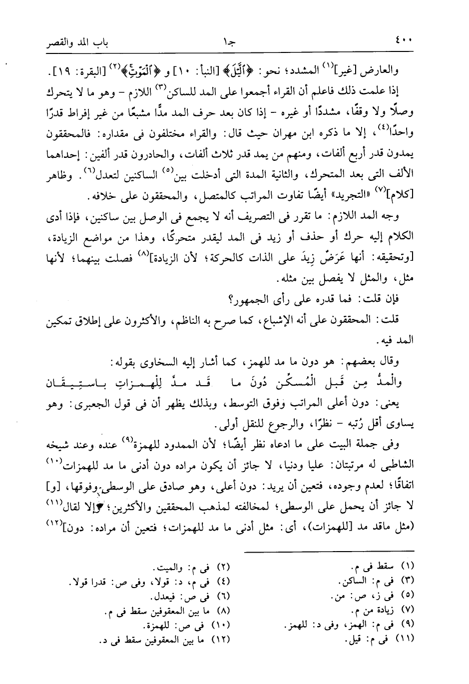وفى جملة البيت على ما ادعاه نظر أيضا؛ لأن الممدود للهمزة (¬9) عنده وعند شيخه الشاطبى له مرتبتان: عليا ودنيا، لا جائز أن يكون مراده دون أدنى ما مد للهمزات (¬10) اتفاقا؛ لعدم وجوده، فتعين أن يريد: دون أعلى، وهو صادق على الوسطى وفوقها، [و] لا جائز أن يحمل على الوسطى؛ لمخالفته لمذهب المحققين والأكثرين؛ وإلا لقال (¬11) (مثل ما قد مد [للهمزات)، أى: مثل أدنى ما مد للهمزات؛ فتعين أن مراده: دون] (¬12)