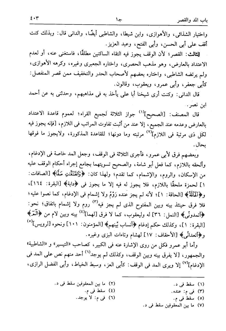 وبعضهم فرق لأبى عمرو، فأجرى الثلاثة فى الوقف، وجعل المد خاصة فى الإدغام، وألحقه باللازم، كما فعل أبو شامة، والصحيح تسويتهما بجامع إجراء أحكام الوقف عليه من الإسكان، والروم، والإشمام، كما تقدم؛ ولهذا كان: وَالصَّافَّاتِ صَفًّا [الصافات: