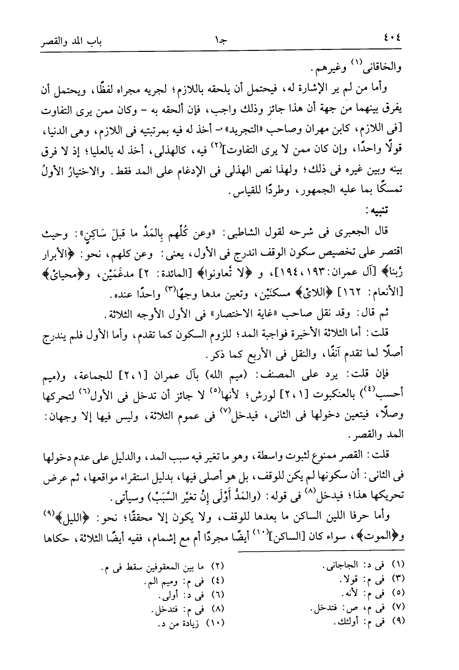 وأما من لم ير الإشارة له، فيحتمل أن يلحقه باللازم؛ لجريه مجراه لفظا، ويحتمل أن يفرق بينهما من جهة أن هذا جائز وذلك واجب، فإن ألحقه به- وكان ممن يرى التفاوت [فى اللازم، كابن مهران وصاحب «التجريد» - أخذ له فيه بمرتبتيه فى اللازم، وهى الدنيا، قولا واحدا، وإن كان ممن لا يرى التفاوت] (¬2) فيه، كالهذلى، أخذ له بالعليا؛ إذ لا فرق بينه وبين غيره فى ذلك؛ ولهذا نص الهذلى فى الإدغام على المد فقط. والاختيار الأول تمسكا بما عليه الجمهور، وطردا للقياس.