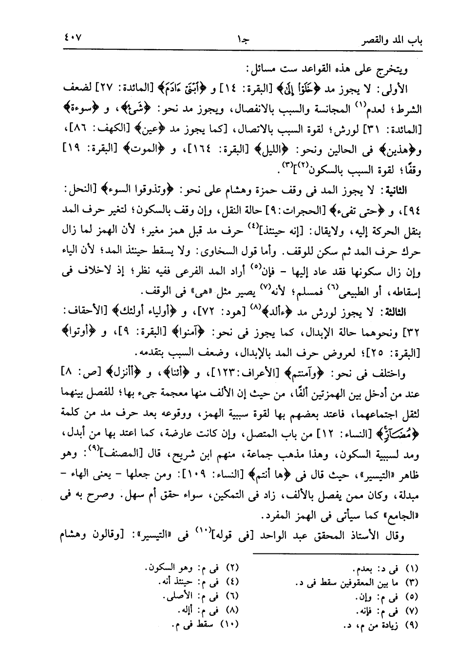واختلف فى نحو: وآمَنْتُمْ [الأعراف: 123]، وأَ إِنَّا*، وأَ أُنْزِلَ [ص: 8] عند من أدخل بين الهمزتين ألفا، من حيث إن الألف منها معجمة جىء بها؛ للفصل بينهما لثقل اجتماعهما، فاعتد بعضهم بها لقوة سببية الهمز، ووقوعه بعد حرف مد من كلمة مُضَارٍّ [النساء: 12] من باب المتصل، وإن كانت عارضة، كما اعتد بها من أبدل، ومد لسببية السكون، وهذا مذهب جماعة، منهم ابن شريح، قال [المصنف] (¬9): وهو ظاهر «التيسير»، حيث قال فى ها أَنْتُمْ [النساء: 109]: ومن جعلها- يعنى الهاء- مبدلة، وكان ممن يفصل بالألف، زاد فى التمكين، سواء حقق أم سهل. وصرح به فى «الجامع» كما سيأتى فى الهمز المفرد.